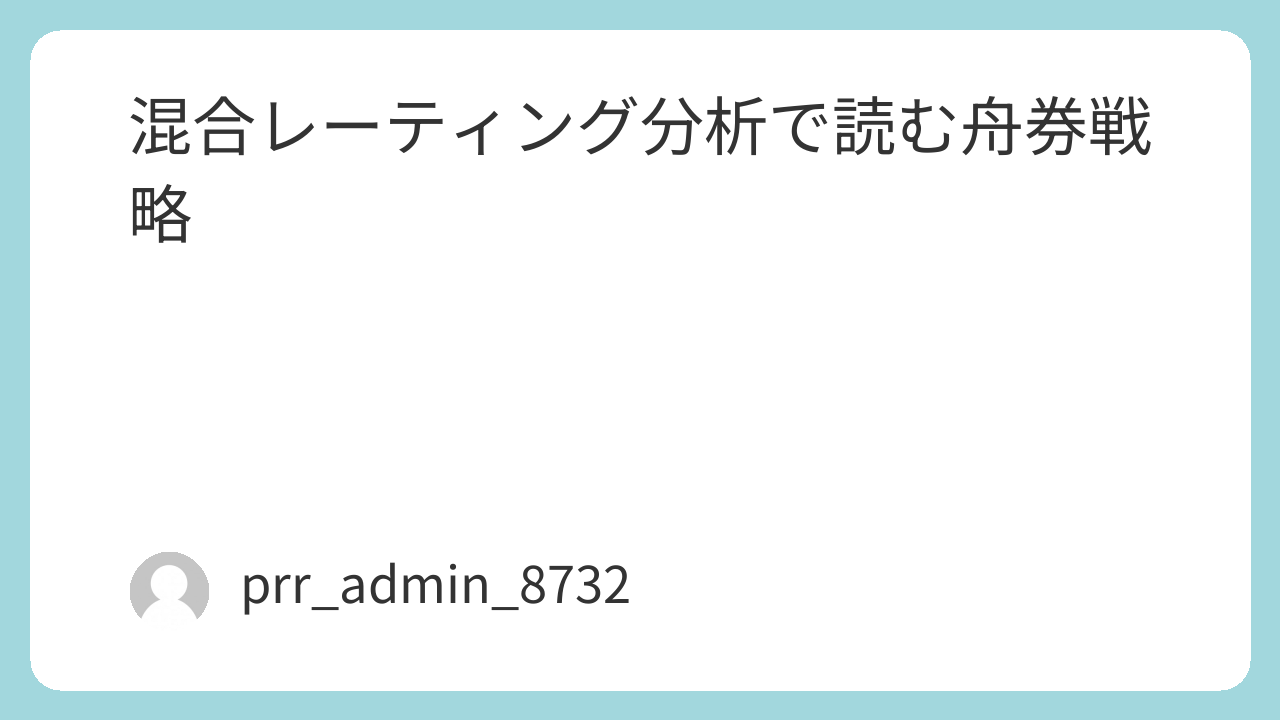 本稿では、川口オート12Rにおける「試走タイム」「ハンデ差」「スタート能力」「良湿別2連対率」「1コーナー侵入予測」を統合した混合レーティング(MR:Mixed Rating)を構築し、データアナリスト視点でレース構造を分解する。画像データに含まれる全選手の基礎指標を統合し、レースの“支配力”を定量化する。