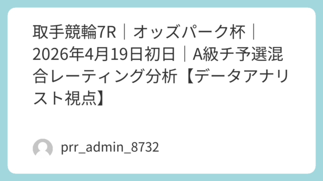 本記事は、2026年4月19日(初日)に取手競輪場で開催されるオッズパーク杯 7R A級チャレンジ予選(1625m・三分戦)を対象に、データアナリスト視点で構築した混合レーティング(MR:Mixed Rating)分析を用いて、展開・ライン...