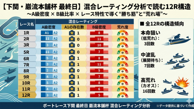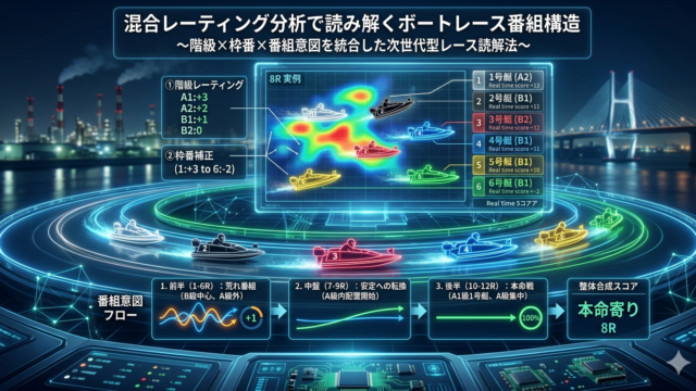 〜階級×枠番×番組意図を統合した次世代型レース読解法〜■序章:なぜ「混合レーティング分析」が必要なのかボートレースの番組表には、A1 / A2 / B1 / B2という階級情報が必ず付与されている。しかし多くの予想記事は、「A1が強い」「B...