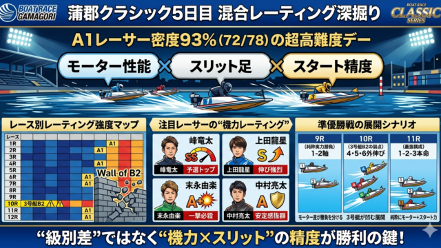 【序章】A1密度93%の異常値が示す“超高難度デー”第61回ボートレースクラシック(蒲郡)5日目は、全12R中10RがA1レーサーのみで構成されるという、シリーズでも屈指のハイレベルな番組構成となった。A1比率は実に 93%(72/78)。...