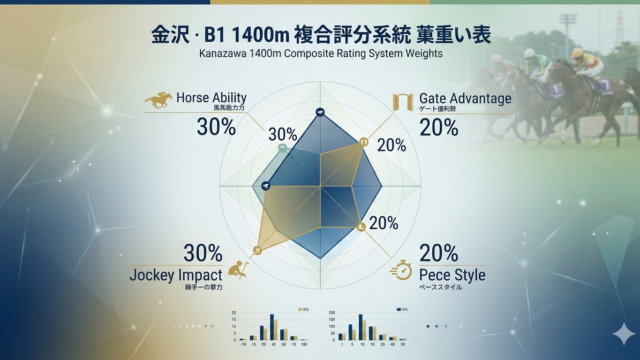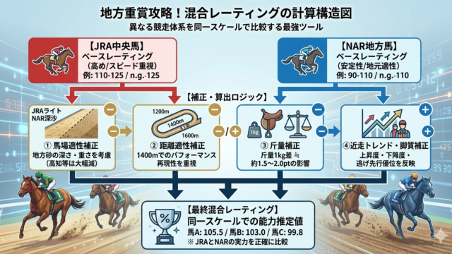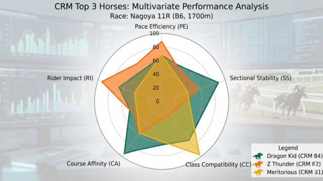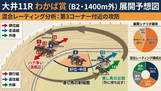 名古屋11R(2026年3月25日・B6組1700m)は、地方競馬の中でも「能力差が露骨に出るクラス構造」と「脚質適性が勝敗を大きく左右するコース特性」が重なる、分析価値の高いレースである。本稿では、出走馬12頭を対象に、混合レーティング(...