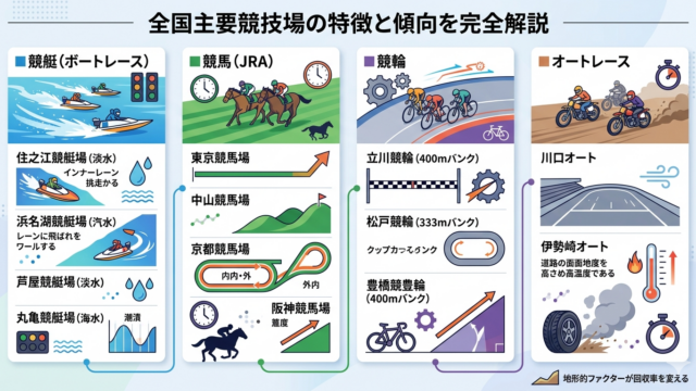 【全国主要競技場の特徴と傾向を完全解説】公営競技の攻略で最も軽視されがちだが、実は回収率に直結するのが「競技場ごとの特徴と傾向」である。競艇・競馬・競輪・オートのすべてにおいて、コース形状・風向き・水質・バンク特性・馬場構造などの“地形的要...