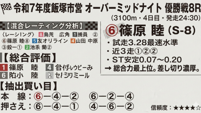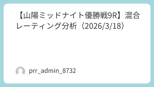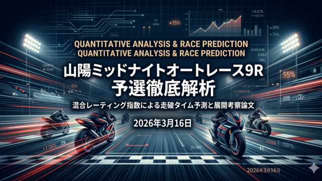 山陽3100m|良走路想定|23:40発走本稿では、山陽ミッドナイト優勝戦9R(2026年3月18日)の出走6名を対象に、混合レーティング(MR:Mixed Rating) を中心とした総合評価を構築する。MRは以下の構成比で算出する。近3...