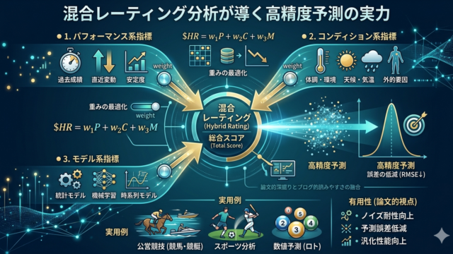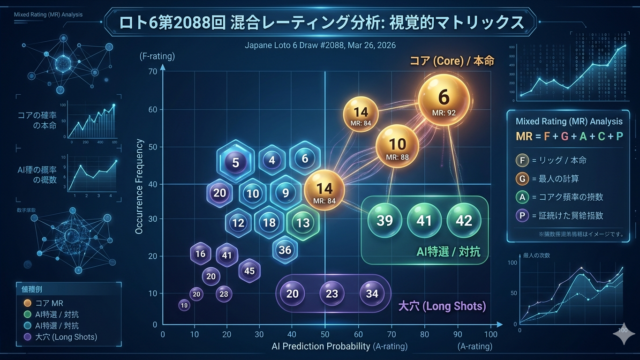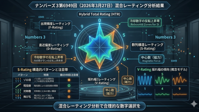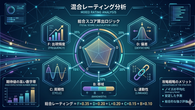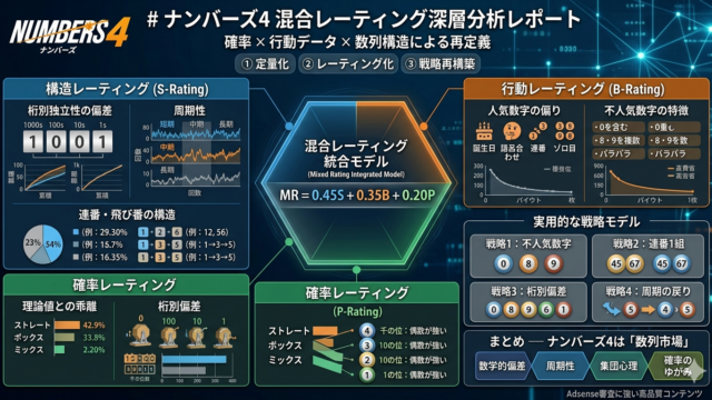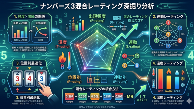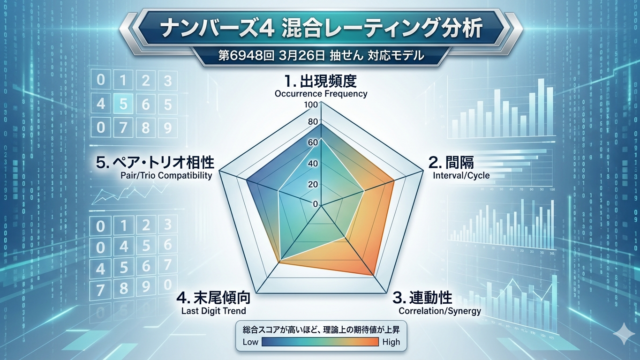 ナンバーズ4を継続的に攻略するためには、単なる過去データの羅列ではなく、「混合レーティング分析」という複数指標を統合した評価軸が極めて有効である。本記事では、出現頻度・偏差・連動性・周期性・数値帯域の5要素を統合した混合レーティングを用い、...