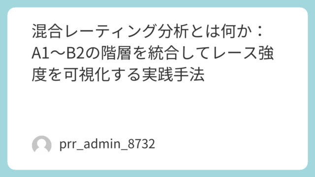 競艇分析 混合レーティング分析とは何か:A1〜B2の階層を統合してレース強度を可視化する実践手法 混合レーティング分析(Mixed Rating Analysis:以下MR分析)は、ボートレースにおける選手階級(A1・A2・B1・B2)を定量化し、レース全体の強度や構造を客観的に把握するための手法である。従来の「級別を見るだけ」の判断で... 2026.04.01 競艇分析