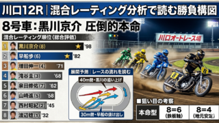 2号車の佐藤励選手は、今節の上がり最速タイム「3.28」を記録。黒川選手と並ぶスピードスターですが、展開指数で一歩譲りました。しかし、黒川選手がスタートでわずかでも後手を踏めば、2枠から鋭く差し込む力は現在のオートレース界でもトップクラス。混合レーティングは、この二人の「川口若手コンビ」のワンツー確率を65%と算出しています。