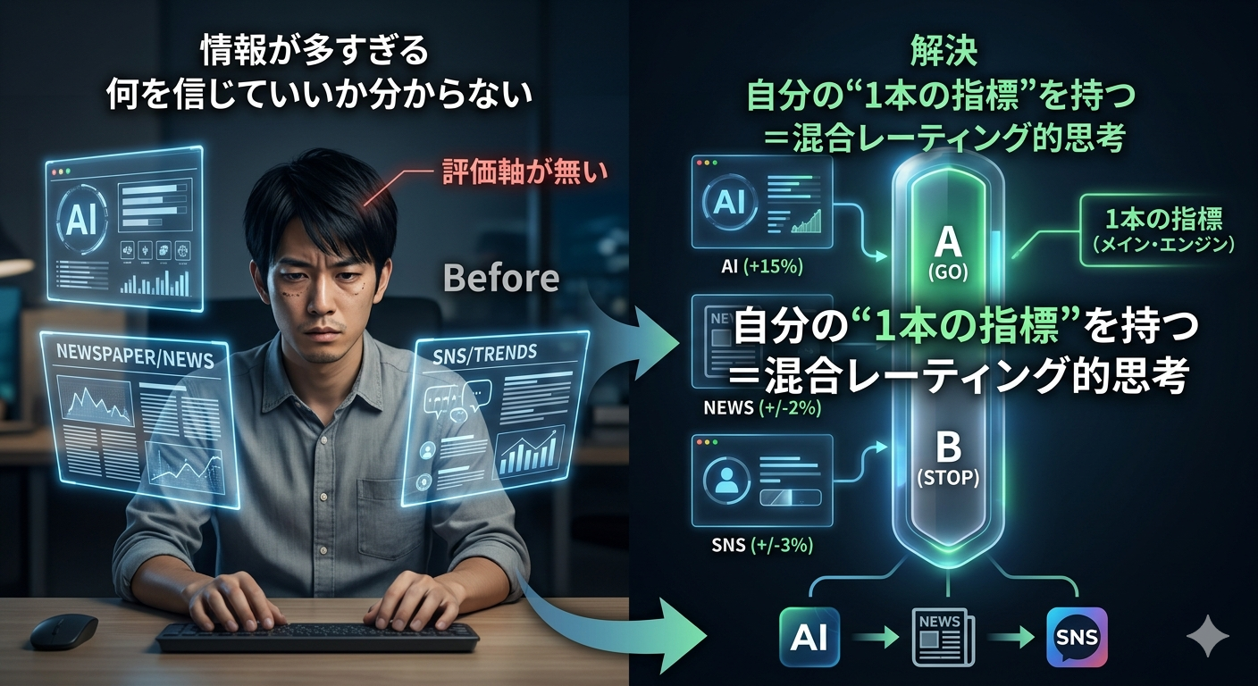 「多くの人間は、2や3をメインに据えて右往左往する。だが、混合レーティング的思考では、外部の情報はすべて『自分の指標を微調整するための変数』に過ぎない。」