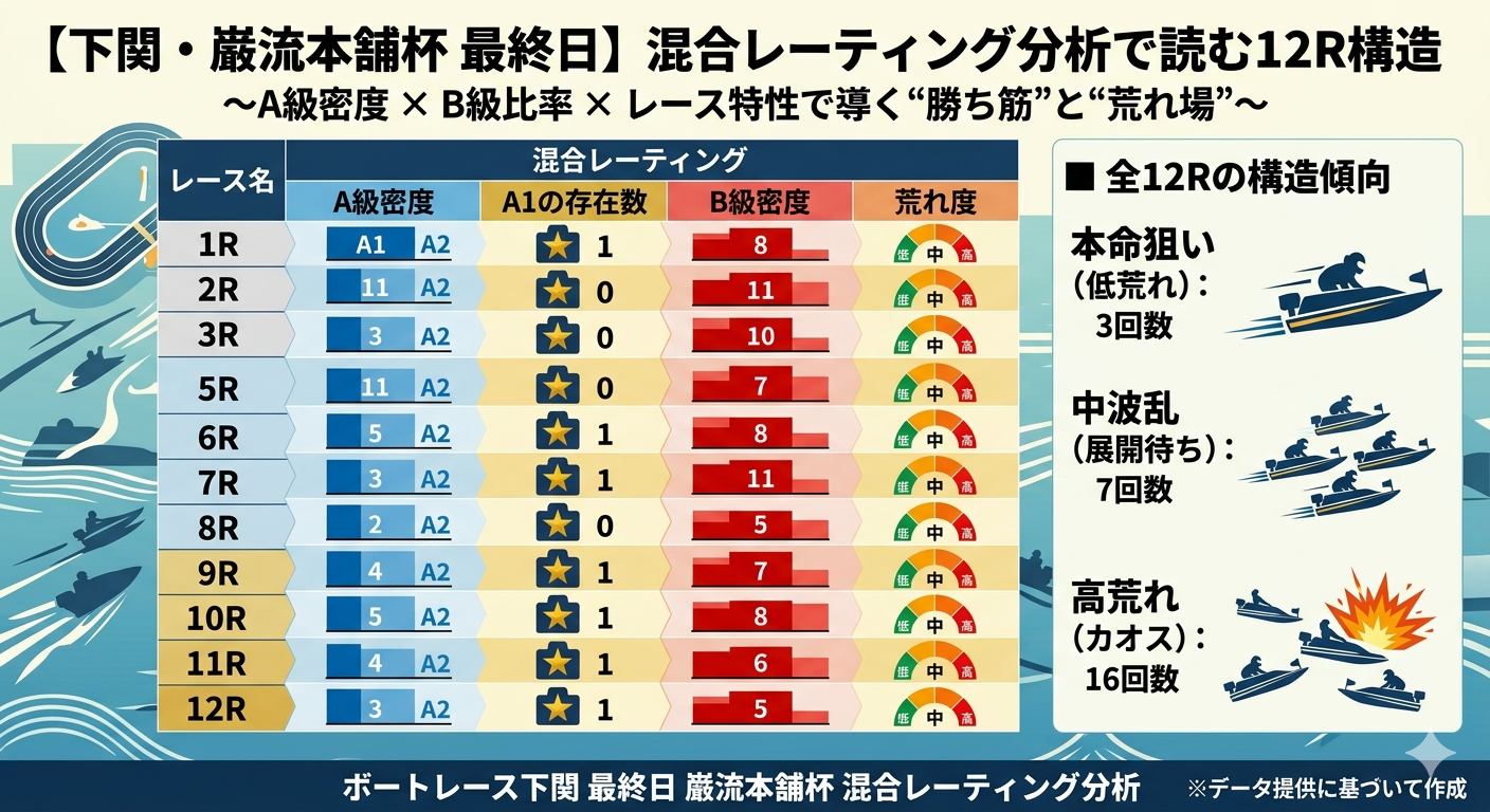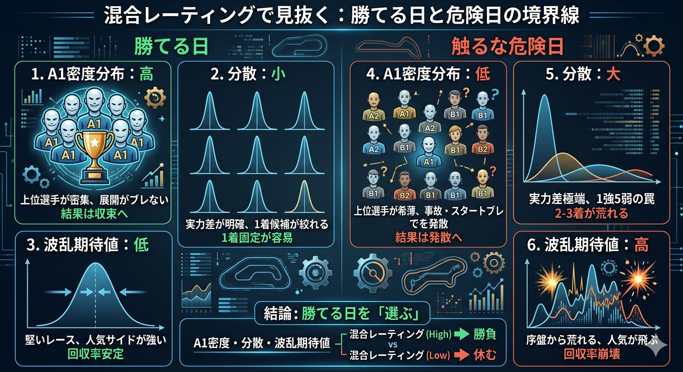 本記事では、混合レーティング(複数指標を統合した総合評価)を軸に、A1密度分布・レース毎レーティング分散・波乱期待値(標準偏差)を組み合わせて、「今日は勝てる日か?」を事前に判別するロジックを体系化する。