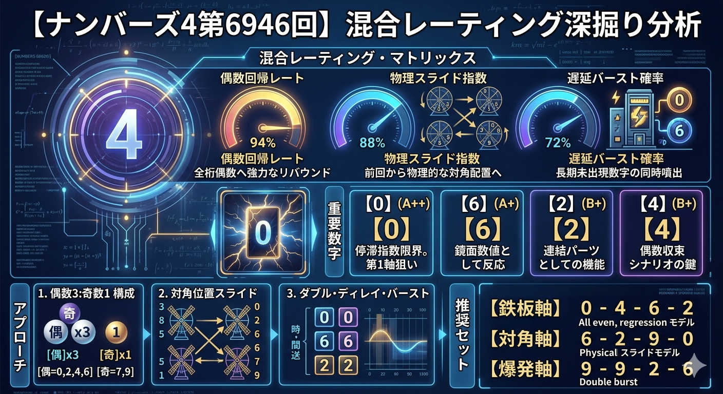 ナンバーズ4第6946回(抽せん日:2026年3月24日)を題材に、出目傾向・構造的偏差・確率的揺らぎ・統計的安定度を統合した「混合レーティング分析」を実施する。本稿は、単なる当選番号の紹介ではなく、宝くじデータを運用視点で評価するための“構造的理解”を目的とした技術記事である。広告収益(AdSense)を意識しつつ、検索意図を満たす深掘り型コンテンツとして最適化した。