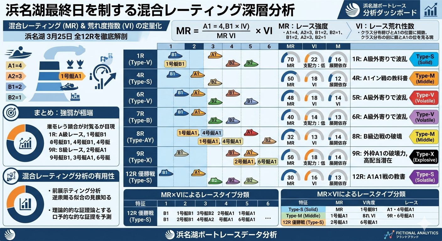 ボートレースの番組表は、単なる階級の羅列ではない。そこには「レースの構造」「波乱の芽」「堅い軸」「展開の制約条件」など、勝敗を左右する複雑な情報が折り重なっている。本稿では、尼崎最終日の番組表を題材に、混合レーティング分析(Mixed Rating Analysis)を用いてレースの本質を深掘りする。これは従来のA1/A2/B1/B2という階級評価を、統計的・構造的に再解釈し、レース強度・波乱度・展開制約を数値化する試みである。