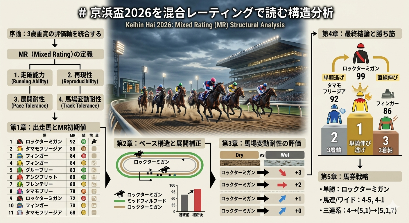 京浜盃(JpnII)は南関クラシック路線の核心であり、3歳馬の能力差が最も顕著に表れるステージである。本稿では、従来のスピード指数・ラップ適性・血統耐性に加え、混合レーティング(MR:Mixed Rating) を導入し、馬ごとの潜在能力を多角的に評価する。MRは「走破能力」「再現性」「展開耐性」「馬場変動耐性」の4軸を統合した複合指標であり、単なる指数比較よりも“なぜその馬が強いのか”を説明できる点に特徴がある。