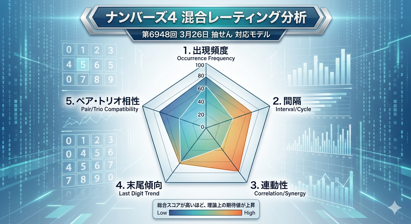 ナンバーズ4は、数字選択式宝くじの中でも「データ分析の効果が最も反映されやすい」ジャンルとして、多くのプレイヤーから注目されています。本記事では、最新回(第6948回・2026年3月26日抽せん)を題材にしつつ、過去データを基盤とした混合レーティング分析を用いて、より高い精度で数字選択を行うための実践的な手法を解説します。