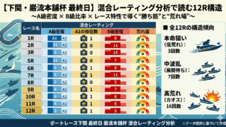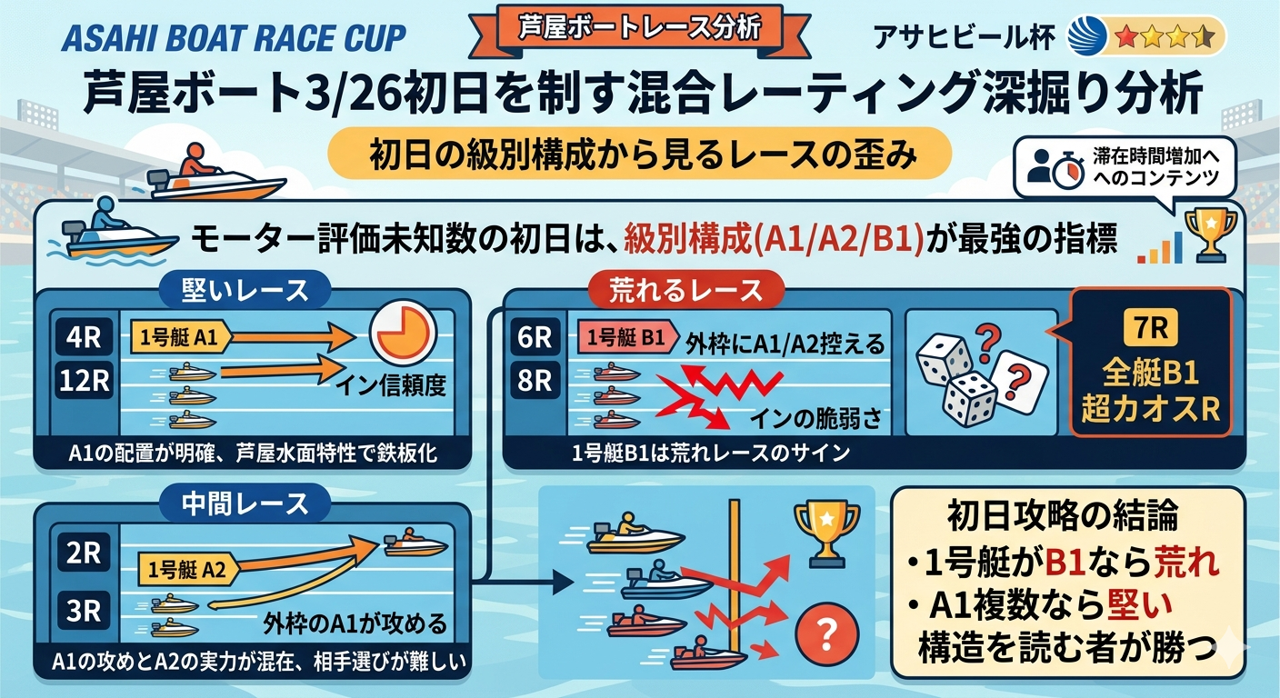 本記事では、芦屋ボートレース場で開催される「アサヒビールカップ」初日の全12Rを対象に、級別構成(A1/A2/B1)を用いた混合レーティング分析を行い、初日特有の荒れ傾向・堅いレース・展開の歪みを深掘りする。