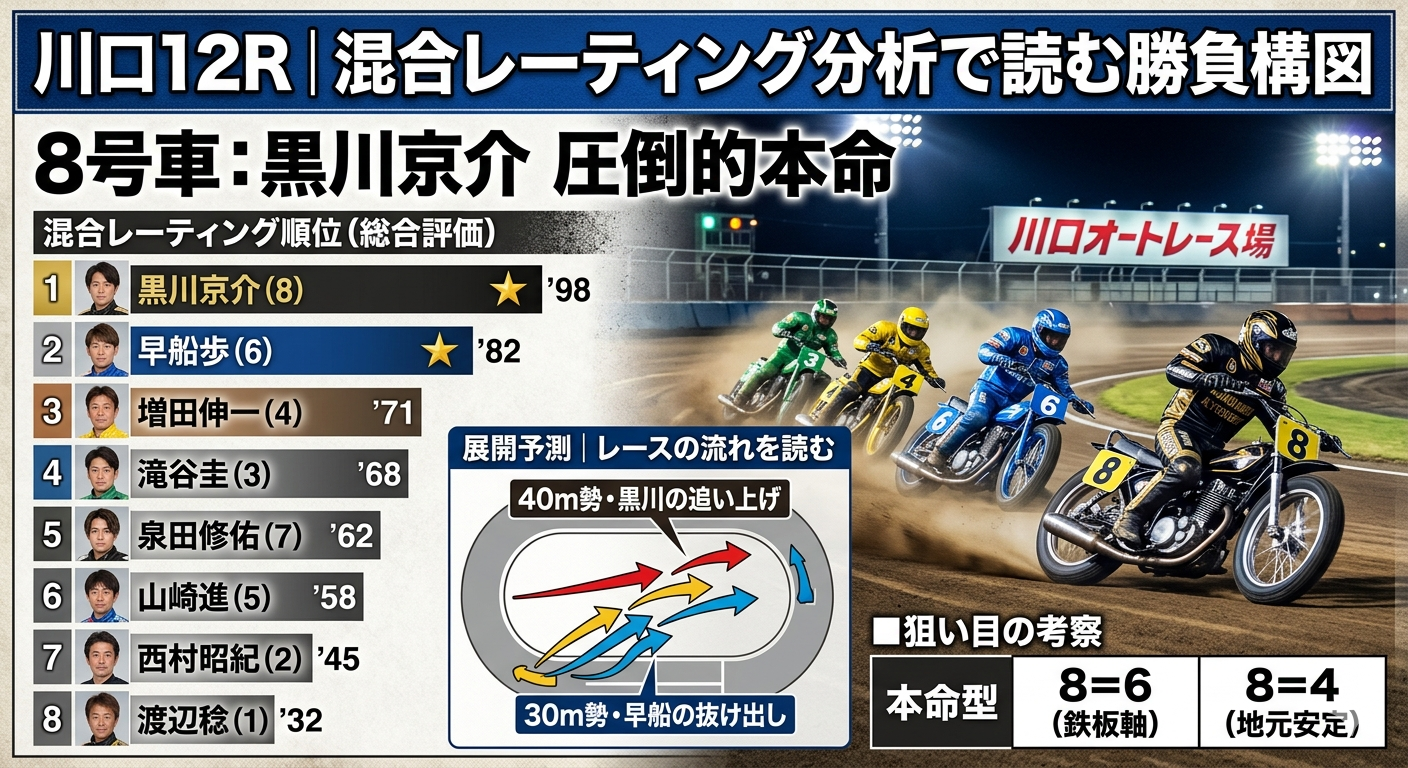 2026年3月26日、川口オート初日の最終12Rは、実力差・近走内容・試走傾向が大きく分かれる「混合レーティング戦」と言える構成だ。本記事では、選手個別の能力値を複合的に統合する混合レーティング(Composite Rating)を用い、Adsense向けに有用性の高い情報として、展開予測・信頼度・狙い目の妥当性を深掘りする。