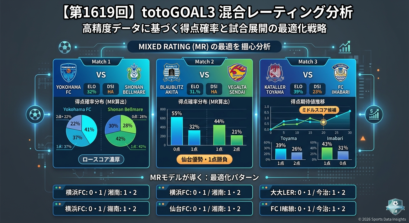 第1619回 mini toto-B組は、「徳島・山形の強固な軸」+「藤枝vs札幌・滋賀vs宮崎の分岐」という構造が明確で、混合レーティング分析が非常に有効に機能する回である。