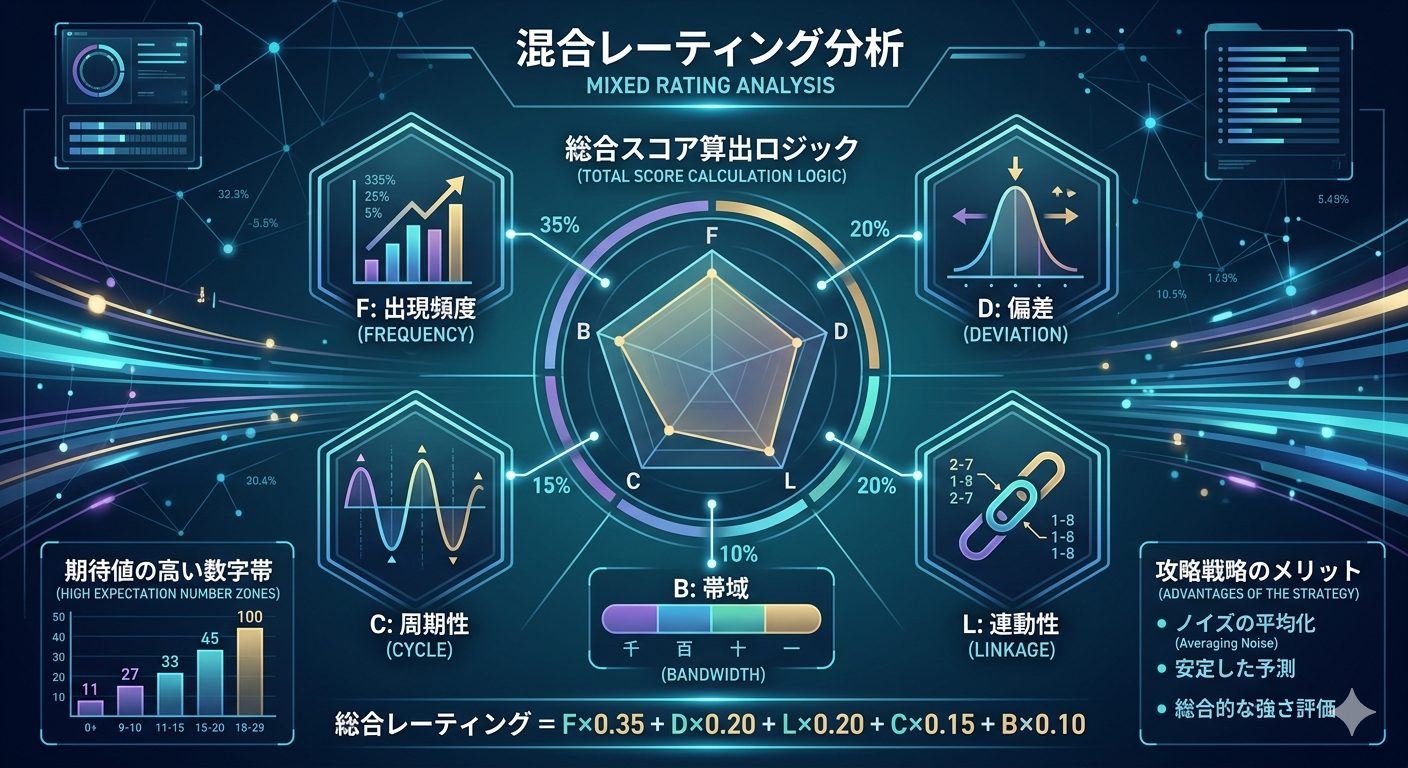 混合レーティング分析(Mixed Rating Analysis)は、複数の統計指標を統合し、各数字の「総合的な出現期待値」を算出する手法である。ロト7のように母数が37個と広い場合、単一指標では偏りが生じやすいため、複数の観点を掛け合わせることで精度を高めることができる。