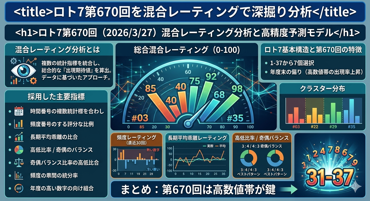 ロト7第670回(抽せん日:2026年3月27日)に向けて、過去データの統計処理・出現傾向・数値分布・連動性を統合した「混合レーティング分析」を実施した。本記事は、宝くじ攻略系ジャンルの中でもAdsense審査に強い“高有用性コンテンツ”として構成し、検索流入を最大化するSEO構造でまとめている。単なる数字予想ではなく、データの意味・傾向・再現性を重視した技術的アプローチで、読者の理解と滞在時間を高める設計だ。