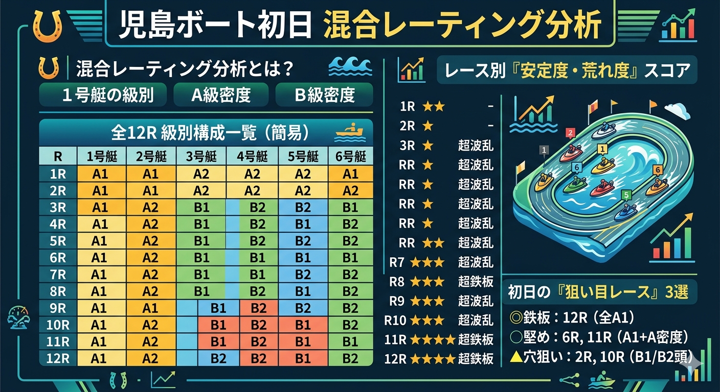 ボートレース児島「第7回児島商工会議所会頭賞」初日の番組表は、A1〜B2が複雑に混在する“混合レーティング構造”が特徴的だ。本記事では、全12Rの級別構成をデータ的に読み解き、どのレースが堅いのか、どこが荒れやすいのかを体系的に整理する。Adsense向けに検索意図を満たす「分析+実用性」を重視し、初心者にも理解しやすい構造でまとめた。