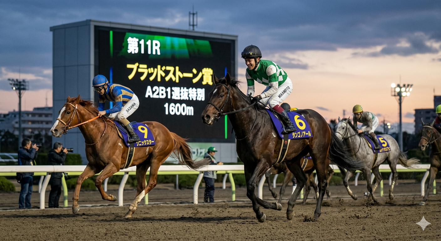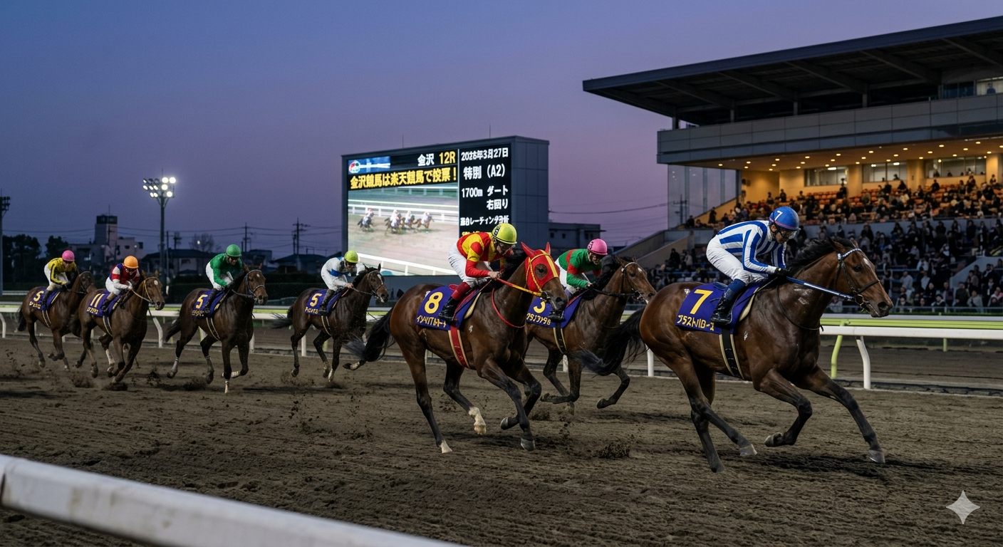 2026年3月27日に行われる金沢競馬12R「金沢競馬は楽天競馬で投票!特別(A2)」は、1700mダート右回りという金沢らしい持続力戦が要求される条件で行われる。A2クラスは金沢の中でも能力差が明確に出やすい階層であり、混合レーティング分析を用いることで、馬ごとの潜在能力・展開適性・騎手補正を総合的に評価できる。