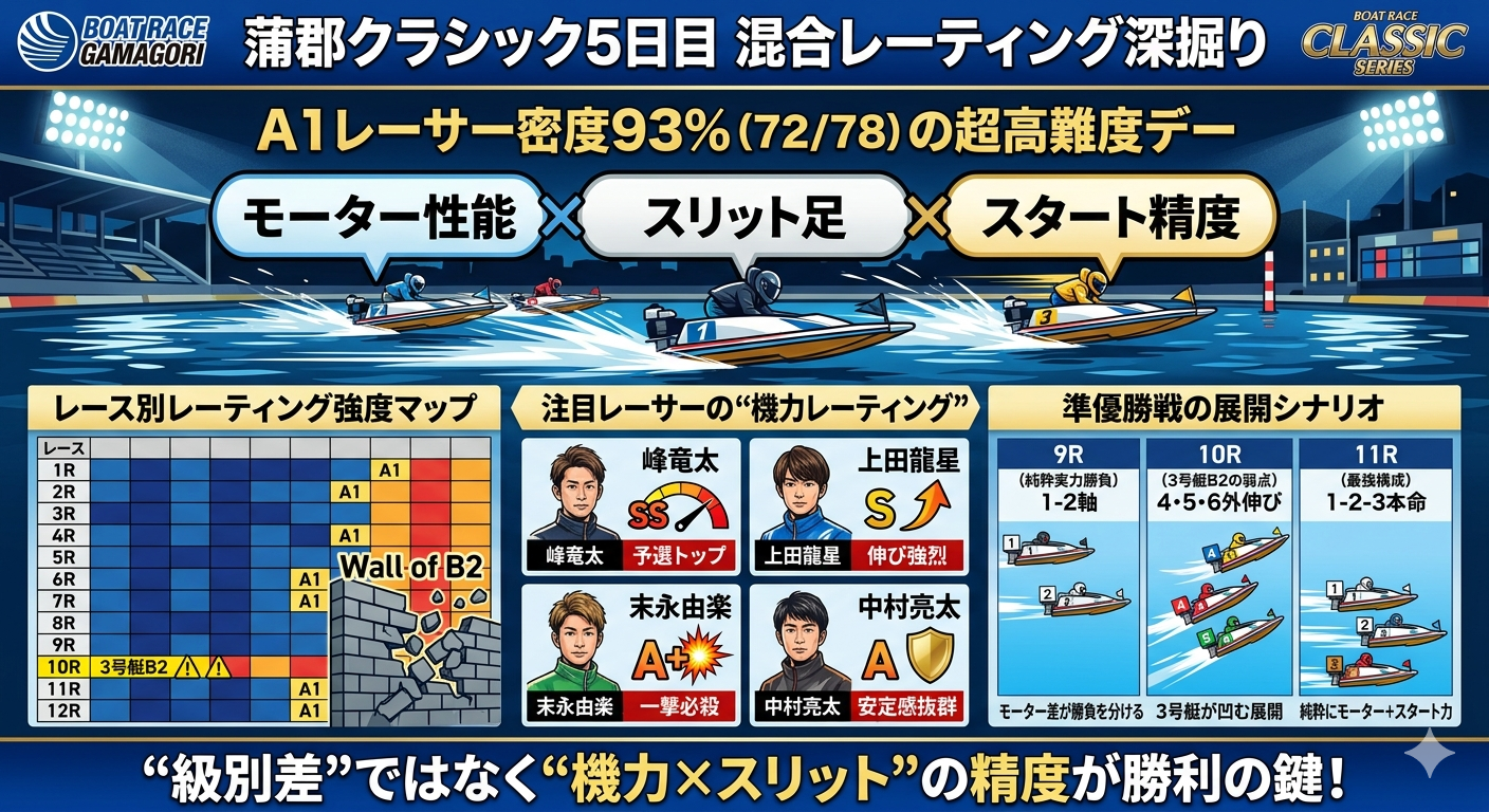 今回の川口12R優勝戦は、20ハン勢の総合力が高く、特に佐藤励の指数が突出している。浜野淳・山田達也が続き、平田・早船が連対候補。0ハン勢は展開の恩恵が必要で、優勝戦レベルでは苦しい構造だ。混合レーティング分析に基づけば、8番佐藤励を中心に据えた組み立てが最も合理的である。