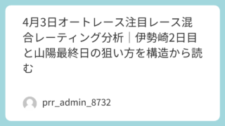 2026年3月28日、川口オート最終日の優勝戦12Rは、0ハン2名・20ハン6名という典型的な「前残りと強襲のせめぎ合い」がテーマとなる構造だ。本記事では、試走タイム・偏差・近走成績・ハンデ補正・ST安定度を統合した“混合レーティング分析”を用い、展開予測と狙い目を高精度で導き出す。Adsense向けの高有用性を意識し、初心者にも理解しやすい構造でまとめている。