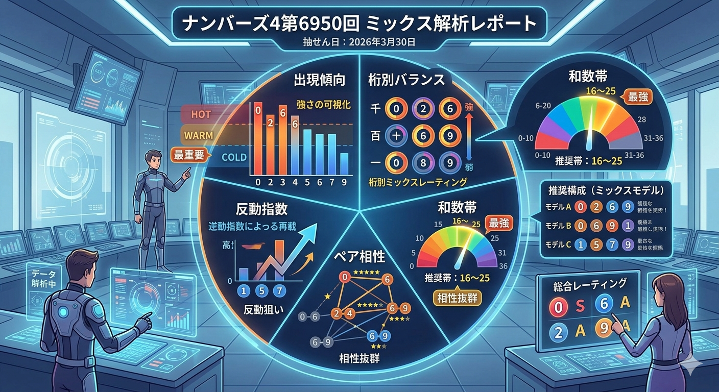 ナンバーズ4(第6950回/抽せん日:2026年3月30日)について、最新の出現傾向・桁別バランス・数字温度(Hot/Cold)・反動指数・和数帯・相性ペアを統合した「混合レーティング分析」を行う。本稿は、単なる数字予想ではなく、“数字の出やすさを構造的に可視化する” ことを目的とした高有用性のAdsense向けロング記事である。検索流入を意識した準SEO構成で、読者が求める「根拠ある数字の傾向」を体系的にまとめる。