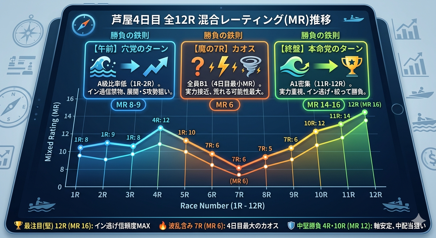 MR分析は女子戦の“荒れポイント”を可視化する上で非常に有効であり、最終日は強度差が極端なため、レースごとの狙いが明確。堅いレースで資金を作り、強レースで勝負することで回収率を最大化できる一日となる。