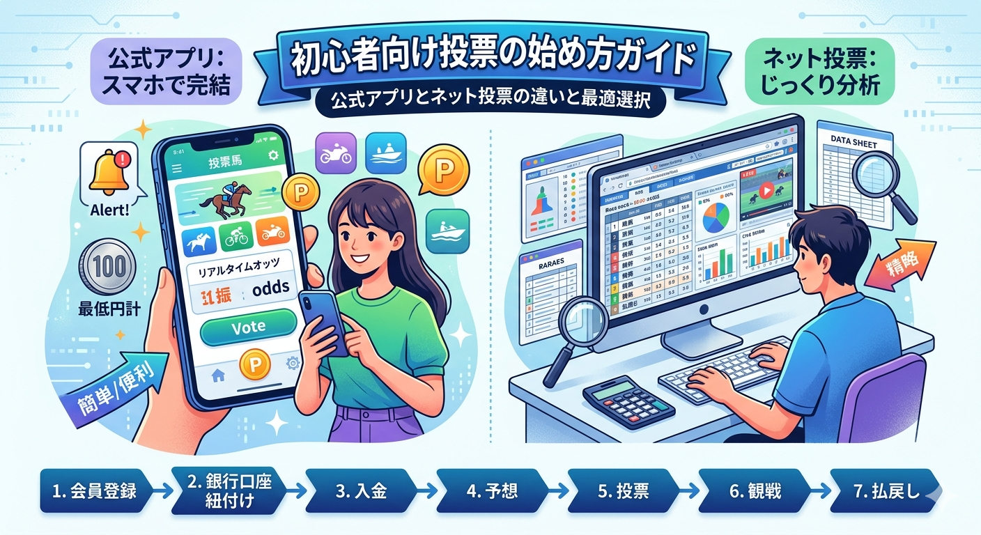 投票を始める際は、まず「公式アプリ」か「ネット投票」かを選ぶことが重要です。スマホで気軽に買いたいならアプリ、データを見ながら精度を上げたいならネット投票が最適です。さらに、初心者は荒れにくい場を選ぶことで勝率が上がり、継続しやすくなります。