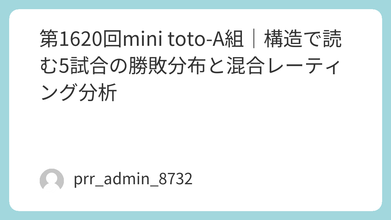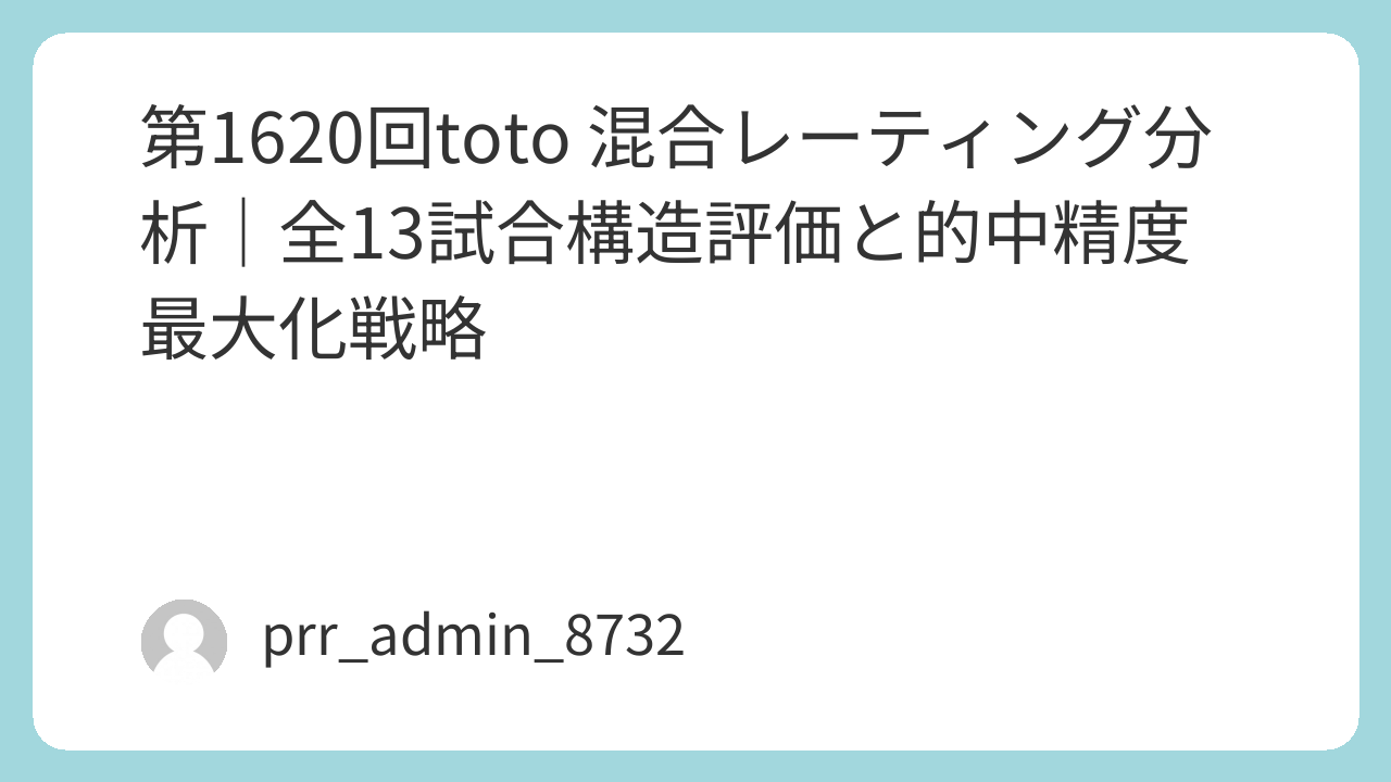 本記事では第1620回totoを対象に、混合レーティング(MRA:Mixed Rating Analysis)を用いた構造分析を行う。単なる戦力比較ではなく、チーム強度・ホームバイアス・日程負荷・戦術相性・市場オッズ歪みを統合し、「確率構造の歪み」を抽出することを目的とする。