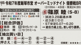 順位選手名MR評価 17 青山 周平96総合力最強・展開優位 26 鈴木 圭一郎92追い込み最強・勝ち切り性能高 35 鈴木 宏和88ST最速・逃げ切りなら 43 高橋 貢82展開読み巧者・連対候補 54 早川 清太郎78中盤型・3着候補 62 伊藤 正真74序盤勝負・粘り込み狙い 71 岩田 行雄70大荒れ時の穴