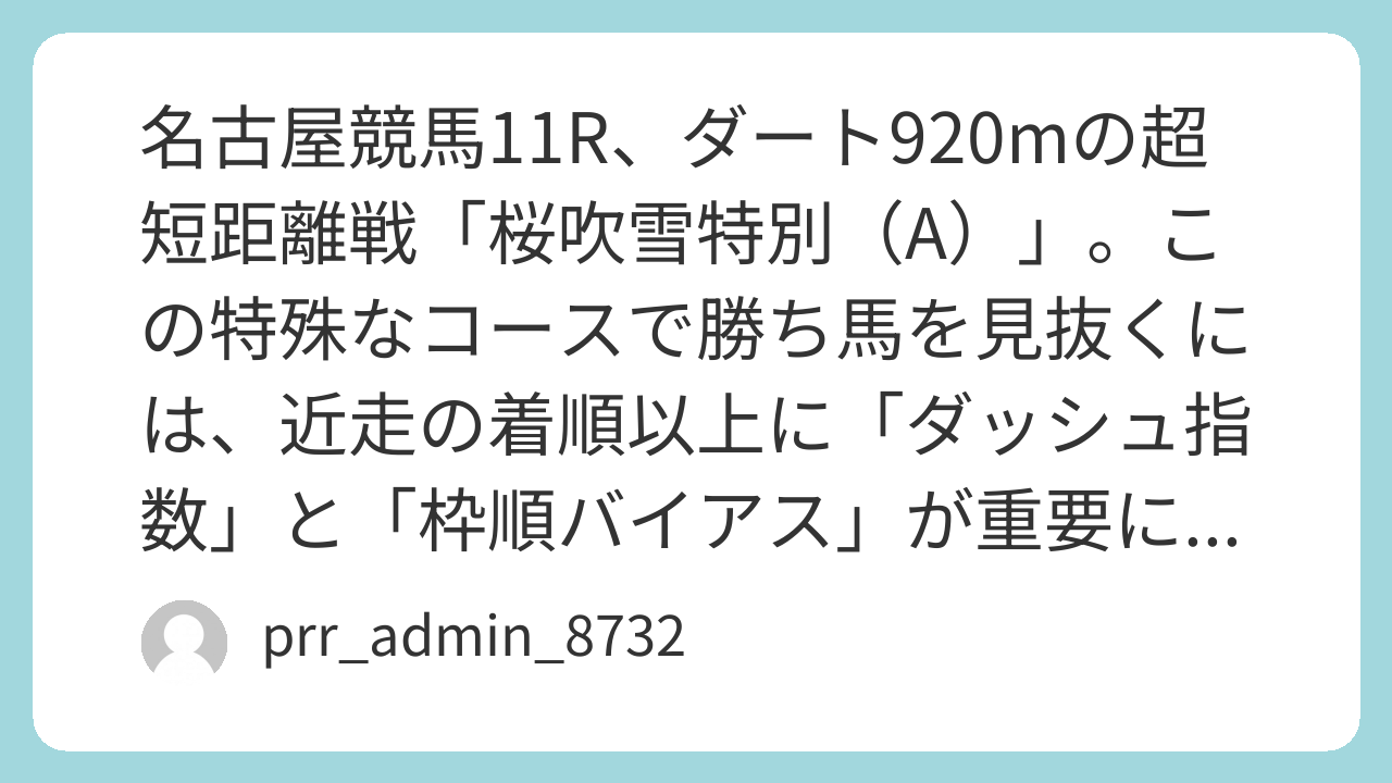 → 先行〜番手が有利 馬 PR コメント 6 +4 番手確保濃厚 4 +3 先行可能 5 +2 中団前で流れに乗れる 8 +1 中団