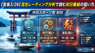 今回の12Rは優勝戦であり、節間を勝ち上がった6名が揃うため、単純な枠番信頼だけでは不十分。モーター性能・節間の上昇度・スタート精度・進入固定性など複数の要素を統合した混合レーティングが最も有効となる。