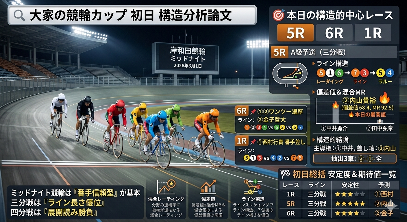 2026年3月1日、岸和田競輪場で開幕する「みんなの競輪カップ」。ミッドナイト開催という特殊な環境下において、車券戦略の核心となるのは単なる「選手の実力」ではない。それは、番組編成者が意図的に配置した「競走得点順位による車番固定」が生み出す、統計的なライン構造の差異である。