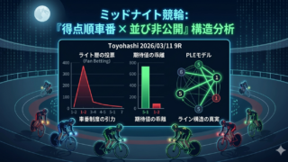 通常の昼間開催やナイター開催と異なり、ミッドナイト競輪は原則として「競走得点上位者が内枠(1番車~)」に配置される(※ガールズや企画レースを除く)。このルールは、ライン形成時において「強い自力選手」と「仕事のできる番手選手」が内枠に集約されやすいことを意味する。結果として、三分戦・四分戦に関わらず、展開の再現性が極めて高く、数理的なアプローチが効力を発揮する。